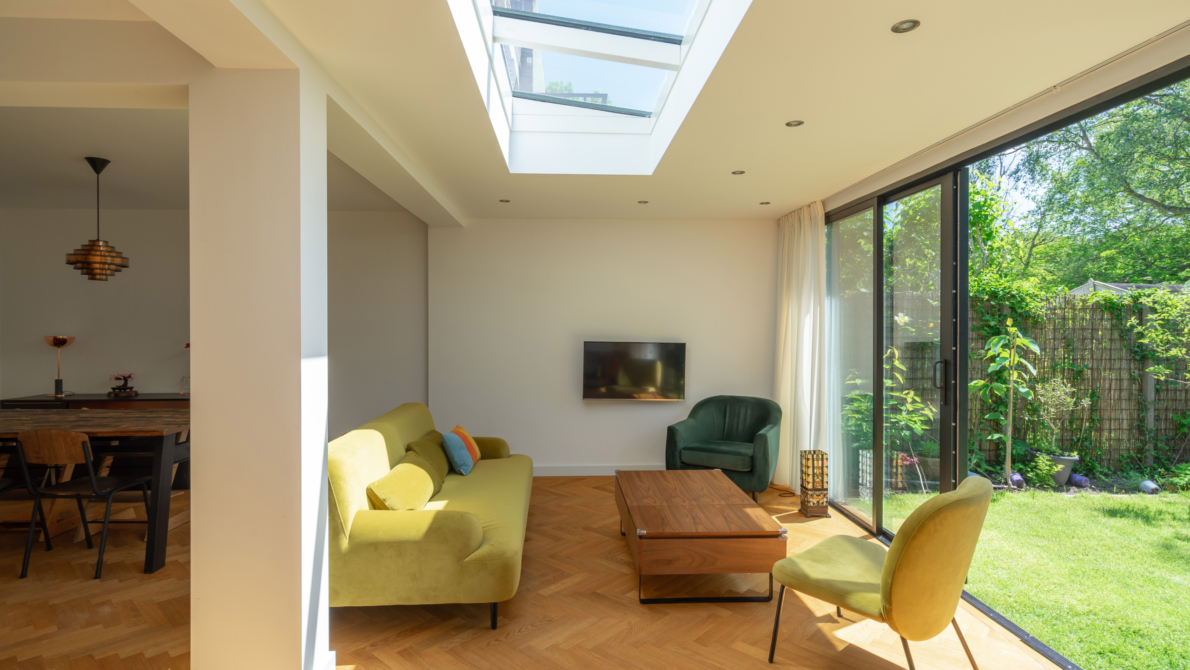 - Veel lichtinval: de drie schuine glasvlakken vangen maximaal daglicht en zorgen voor een heldere, ruimtelijke sfeer.