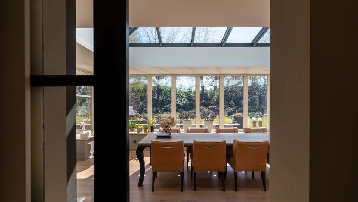 Het riante schilddak van 5,8 bij 2,5 meter is een prachtige toevoeging aan de aanbouw. Het gebruik van HR+++ veiligheidsglas met zonwering zorgt niet alleen voor optimale isolatie, maar ook voor zonwering en comfort in elk seizoen.